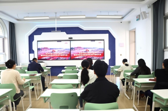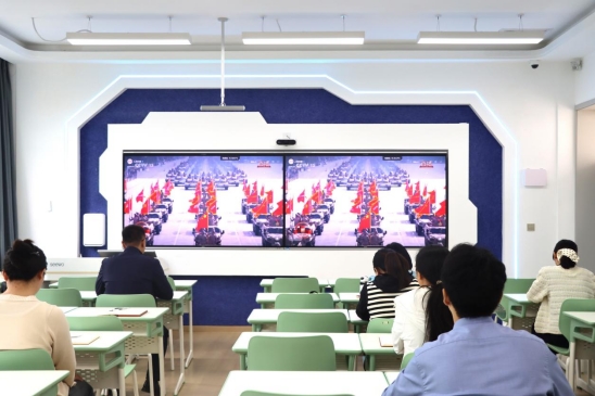 接下来全体教师共同观看阅兵仪式。随着阅兵式的推进,空中护旗梯队如矫健的雄鹰,振翅高飞,划破长空,拉开了这场盛大仪式的序幕。紧接着,徒步方队迈着铿锵有力、整齐划一的步伐,昂首阔步而来,他们英姿飒爽,气宇轩昂,尽显中国军人的威武之姿。战旗方队迎风招展,猎猎作响,每一面旗帜都承载着一段可歌可泣的抗战历史,诉说着先辈们的英勇无畏与顽强拼搏。装备方队如钢铁洪流,气势磅礴,一辆辆先进的战车、一门门威力巨大的火炮,彰显着我国国防和军队建设的辉煌成就,令人叹为观止。空中梯队如雄鹰展翅,翱翔天际,各种先进战机呼啸而过,划出一道道绚丽的轨迹,展现出中国空军的强大实力。