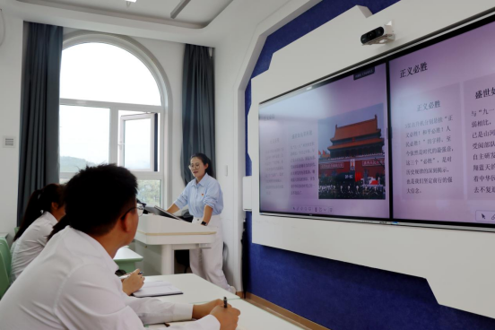 随后,她结合纪念九三阅兵的影像片段,对比“九一八”事变时国家的积贫积弱与如今中国的强盛国力。并指出,九三阅兵中,受阅部队的威武阵容、先进的武器装备,不仅是对革命先烈的告慰,更向世界展现了中国维护和平、捍卫历史的坚定立场。这更是在提醒青年一代,今日的和平来之不易,是无数先烈用生命换来的,必须永远铭记、倍加珍惜。